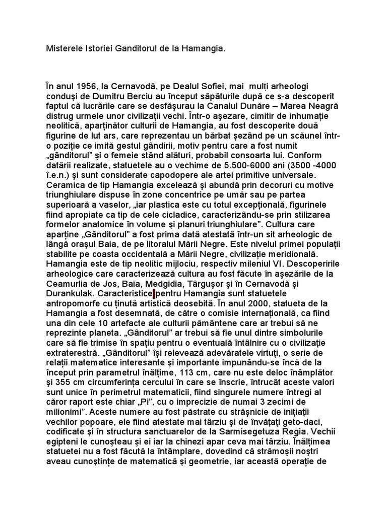 Secretul numărului pi ascuns în statueta gânditorul de la hamangia? Gânditorul de la hamangia, unul dintre cele mai spectaculoase 10 artefacte ale lumii! În apropiere de locul unde în anii '60 a fost descoperit complexul statuar gânditorul de la hamangia şi perechea sa, arheologii au scos la lumină o aşezare preistorică veche, datată cu patru milenii înainte de naşterea lui iisus christos.