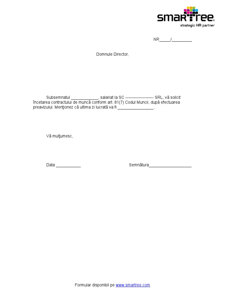 La ce sa fii atent cand semnezi model completat cand se suspenda si cand inceteaza contractul de munca. Model cerere de incetare contract de munca util pentru angajatii care doresc desfacerea contractului de munca din diverse motive. Având în vedere prevederile legii nr.31/1990 cu modificările şi completările ulterioare cu privire la organizarea, funcţionarea şi conducerea societăţilor comerciale; Încheierea contractului individual de muncă reprezintă „acea operaţiune juridică, consecinţă a negocierii individuale, ce presupune realizarea acordului de voinţă a celor două părţi: Cerere de incetare contract individual de munca prin.